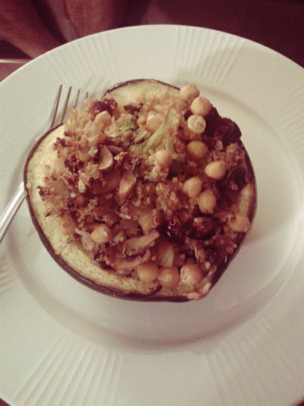 last night I made acorn squash stuffed with quinoa, mushrooms, broccoli, chickpeas, sunflower seeds and craisins. it was so yummy!!!